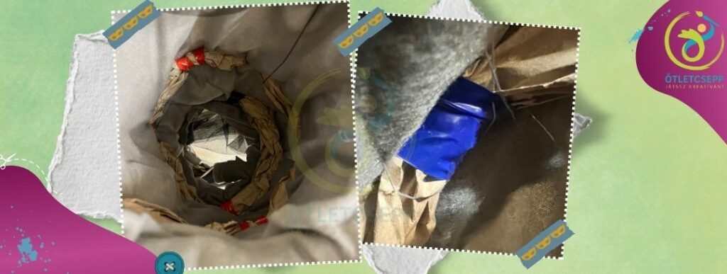 Utána egy-egy ív csomagolópapírt a hosszabb oldala mentén összegyűrve nagyjából 10-15 centinként hozzáragasztottuk szigetelőszalaggal a drótvázhoz. Ezzel a módszerrel sikerült egy kisebb súlyú, de tartós alapot építeni. Ennyi papír nem húzta túlságosan szét a drótot és szépen kiadta az elképzelt tölcsér formát, miközben könnyű volt rárögzíteni a külső rétegeket.