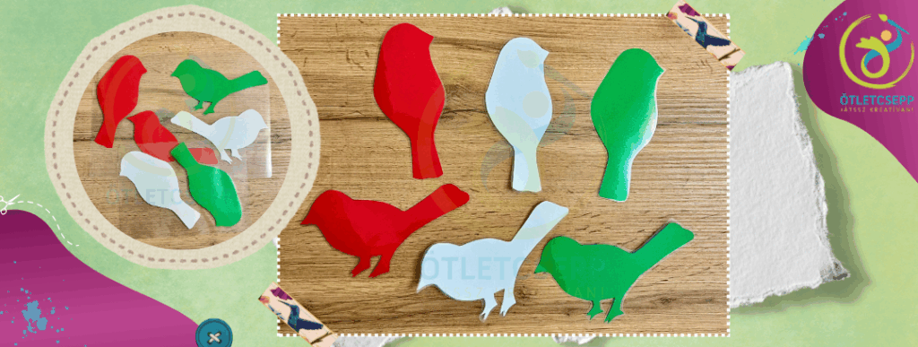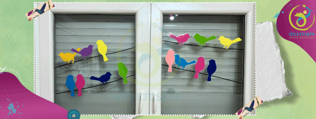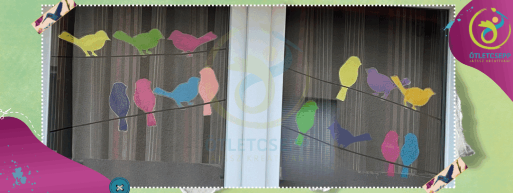 A madarak ülhetnek kerítésen, háztetőn, faágon. Repülhetnek a felhők között, házak vagy virágos rét felett. Nálunk egyszerűen fekete kartonból vágott „villanyvezetékre” kerültek. Persze ezeket akár ablakkrétával, krétafilccel is megrajzolhatjátok vagy lehet festéssel párosítani.