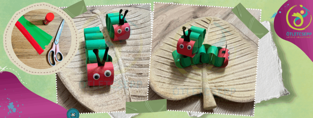 Hernyócskát készíthettek papírláncból, ez már egészen piciknek is sikerül. Ezek a hernyók 12 cm hosszú és 3 cm széles papírcsíkokból készültek el. Így szorosabban illeszkednek a láncszemek, mint a klasszikus papírlánc esetében. Mozgó műszemeket és fekete kartonból vágott csápokat is kapott. A hosszát kedvetek szerint alakíthatjátok.