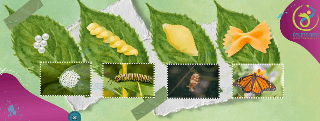 - A laminált zöld levelekre utána nekik kellett olyan dolgokat gyűjteni, ami szerintük jó a 4 ciklushoz. Petének hoztak rizsszemet és apró papírgalacsint, lárvának egy színes fából készült kukacot és egy gyurmakígyót, bábnak kagylótésztát, pillangónak pedig egy lepke ujjbábot és egy filc lepkét a tavalyi tavaszi kosárból (évszakkosár) /természetismeret, kreativitás/