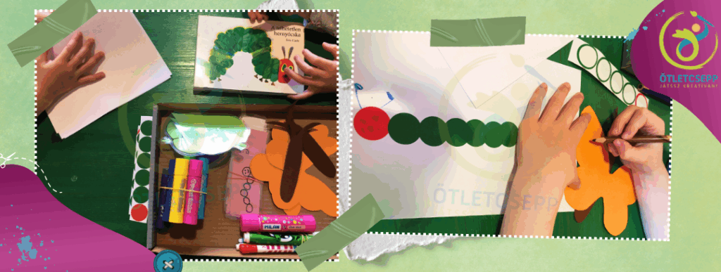 - Először elolvastuk a könyvet, minden napnál, mikor evett a hernyócska, tettek egy kört a lapra (öntapadós kör etikett néven keressétek) /számlálás, hét napjai, finommotorika/